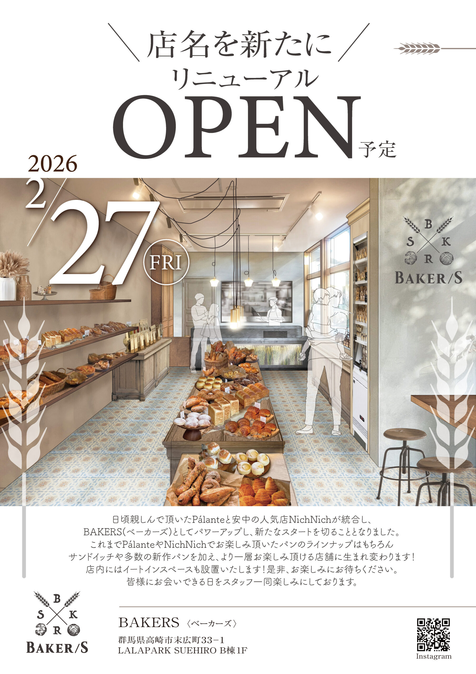 日頃親しんで頂いたPálanteと安中の人気店NichNichが統合し、 BAKERS(ベーカーズ)としてパワーアップし、新たなスタートを切ることとなりました。
